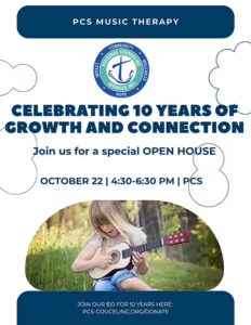 Our Music Therapy Program is turning 10 this year! You’re invited to join us on October 22, 2025, from 4:30 PM til 6:30 PM at Open House. PCS is located at 1205 Applegate Lane in Clarksville, Indiana Benefits of Music Therapy Music therapy provides young people with a safe, non-verbal